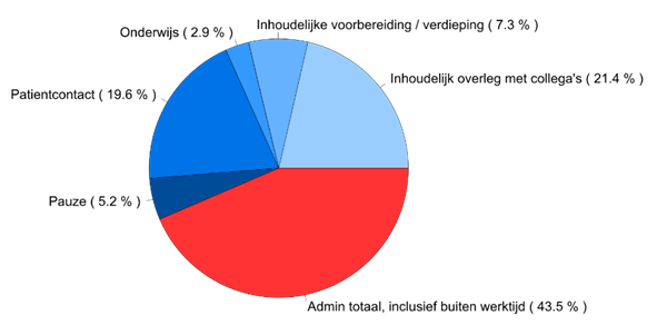 Verdeling van de werktijd, gemiddeld over alle geschaduwde artsen. Onder administratie totaal (rood) valt: registratie en orders, logistiek overleg, documentatie en gerapporteerde administratie buiten werktijd.